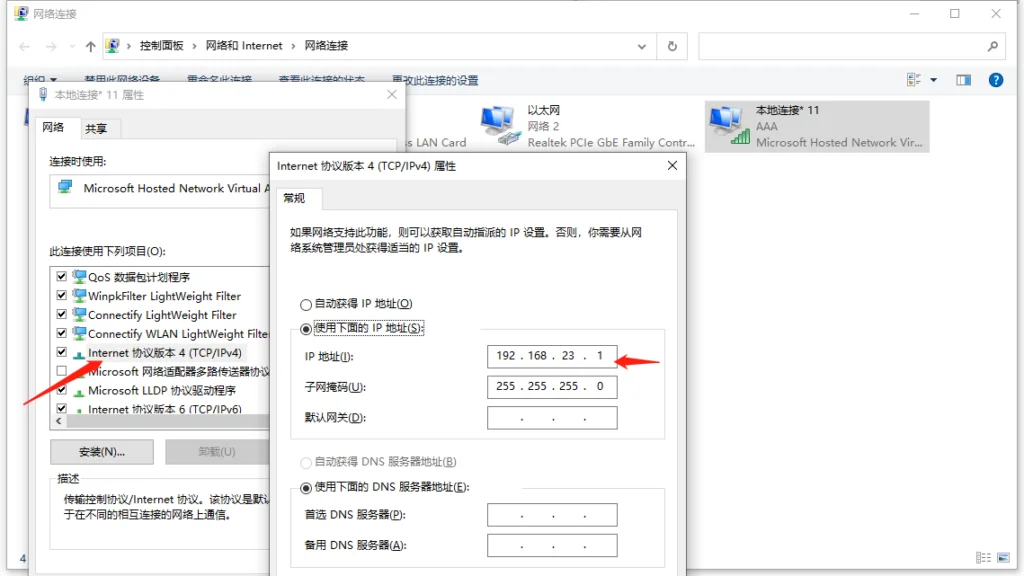 这里的IP地址填什么呢??在那个虚拟热点上右键【属性 - 网络 - Internet 协议版本4(TCP、IPv4)】查看IP地址,最后一位不重复且小于255即可。